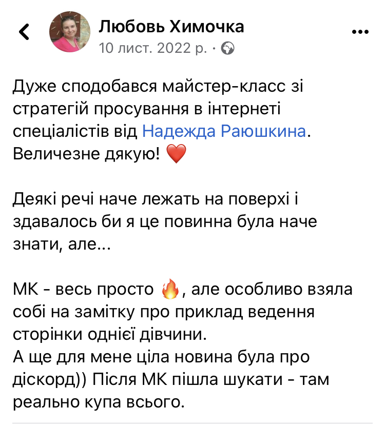 Моя мотивація дуже проста - я хочу зробити свій внесок у розвиток і відбудову українського бізнесу. Якщо захочете і маєте таку можливість, ви зможете зробити донат на будь-яку суму, після отримання курсу. Якщо ні, я буду вдячна за ваші відгуки і рекомендацію цього курсу іншим.